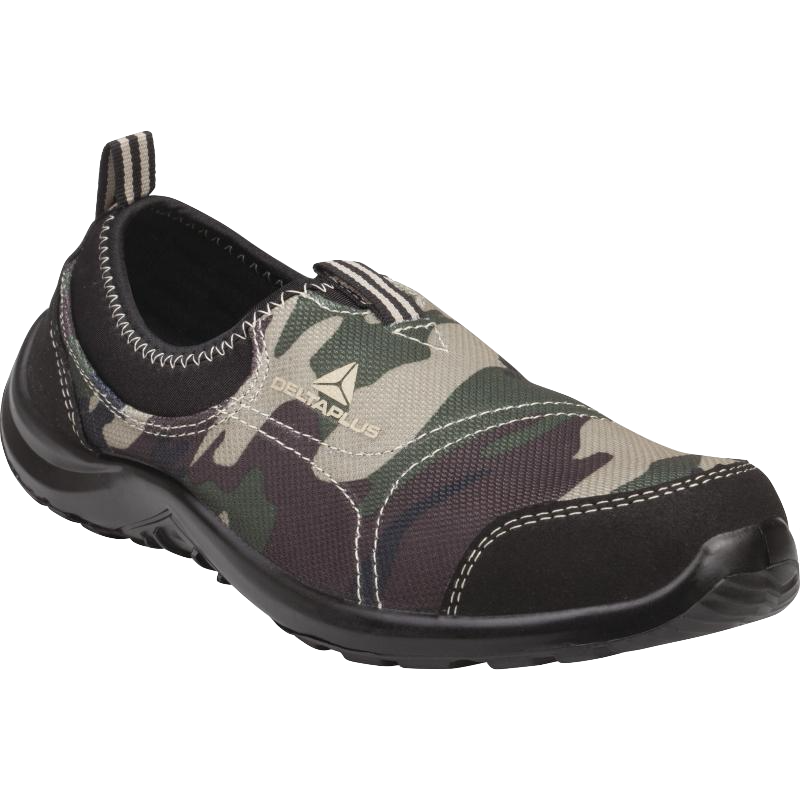 Deltaplus Miami S1P SRC camo. Slechts 396 gram (maat 39). Lage veiligheidsschoenen van polyester en katoen. In een hippe camouflage kleur. Licht van gewicht en koel. Speciaal voor jou in de zomer of in warme ruimtes. Binnenzool is uitneembaar en voorgevormd.
