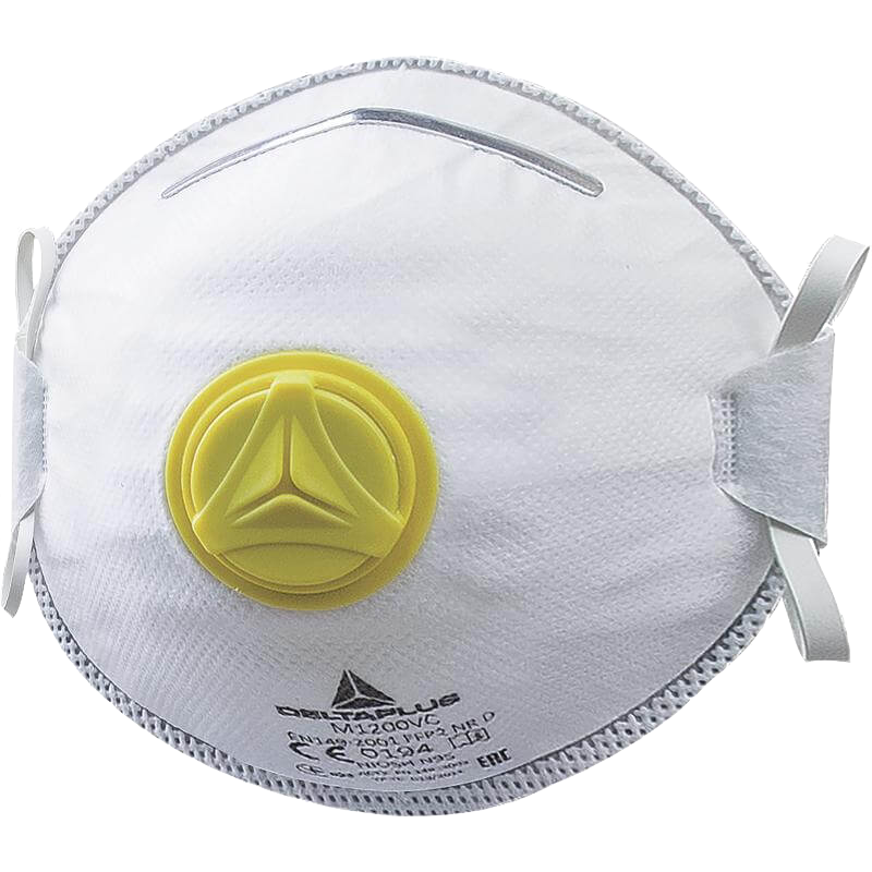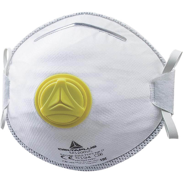 Masker FFP2 met uitademventiel dat bescherming biedt tegen nevels van middelmatig giftige vaste stoffen en vloeistoffen. Schaal van PVC bestaande uit een stel bandjes van elastomeer, een regelbare neusstrip, schuimrandversterking, een onder-neusstrip en een uitademventiel. Dispenserdoos met 10 stuks.